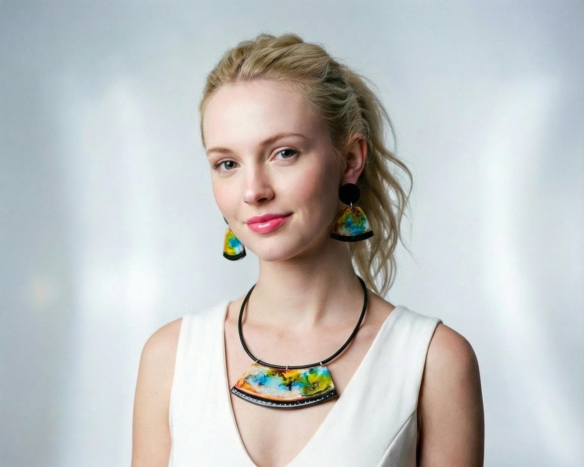 Colorful jewelry sets handmade from polymer clay and painted with alcohol ink....