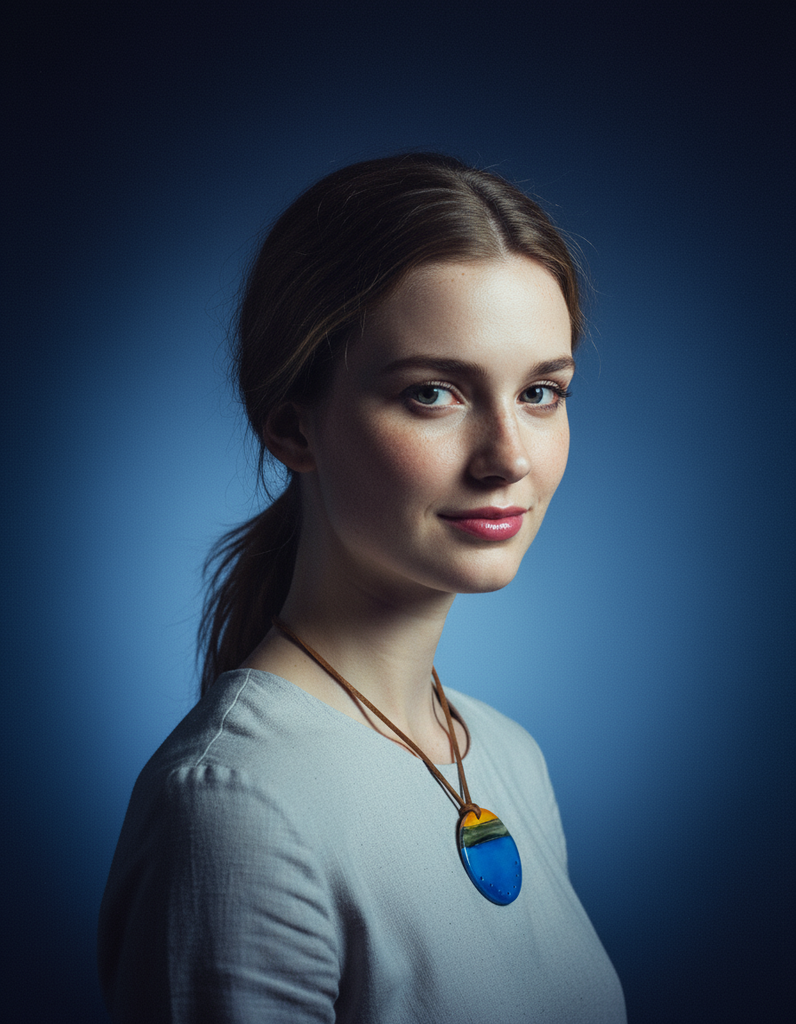 Round blue pendant with a brown cord next to a ruler with floral design on a white background