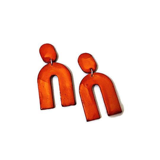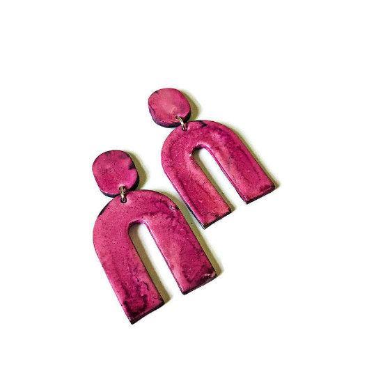 These modern earrings were handmade from polymer clay and painted with alcohol ink. They are large yet lightweight and make a big statement! The earrings feature a smaller oval at the top with either a push back or clip on earring. The bottom portion features a large wishbone shape.