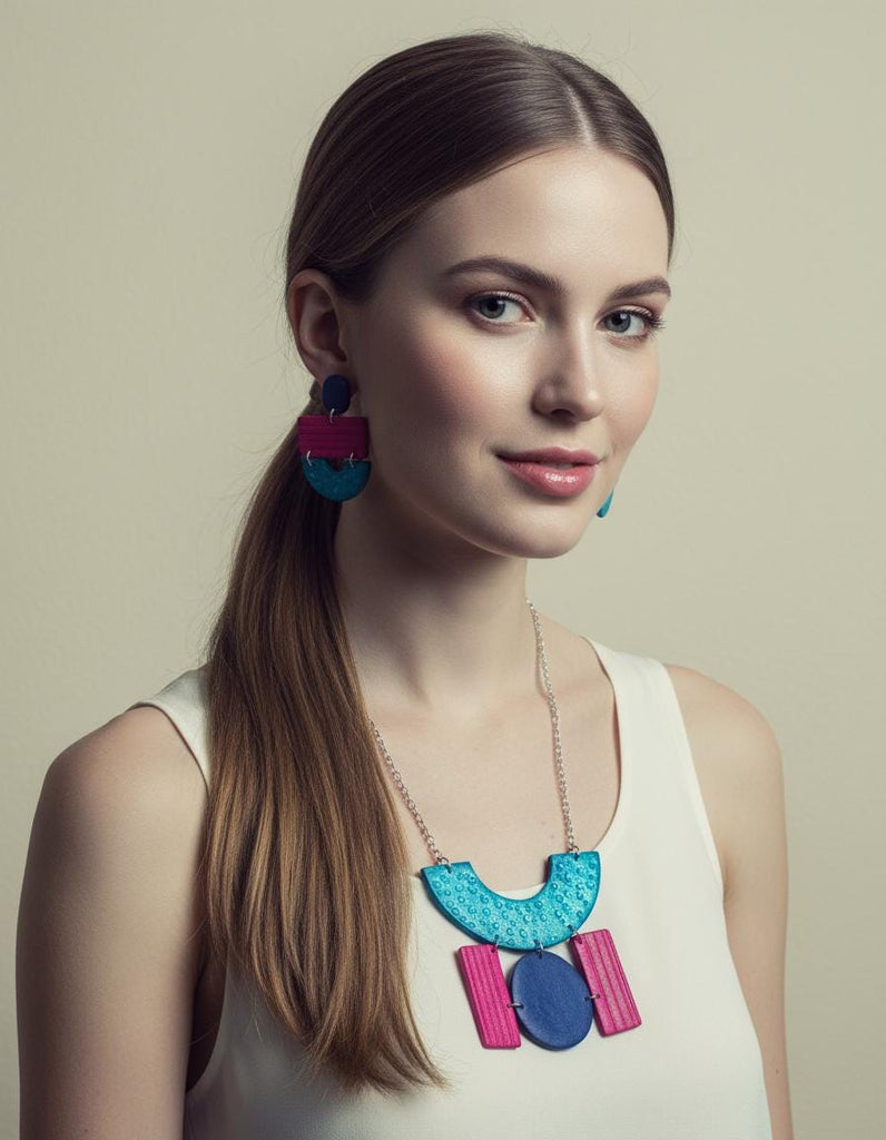 Wide Statement Earrings in Turquoise, Denim Blue & Pink