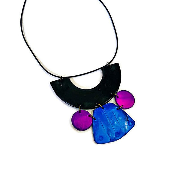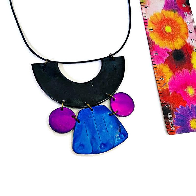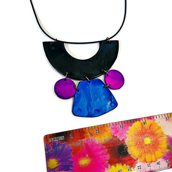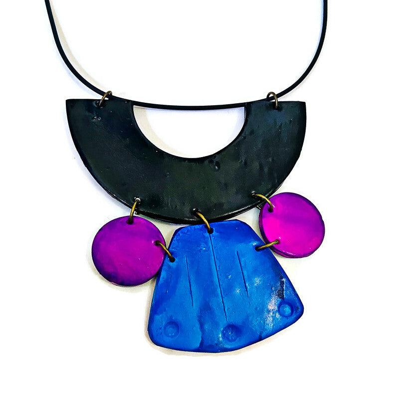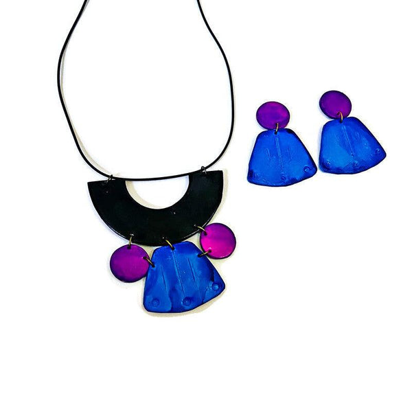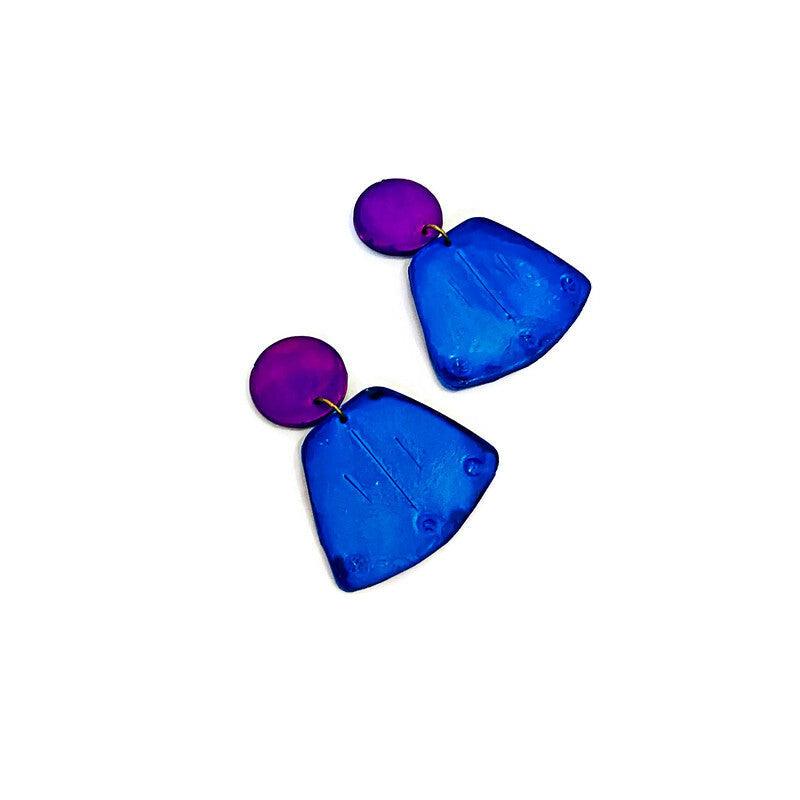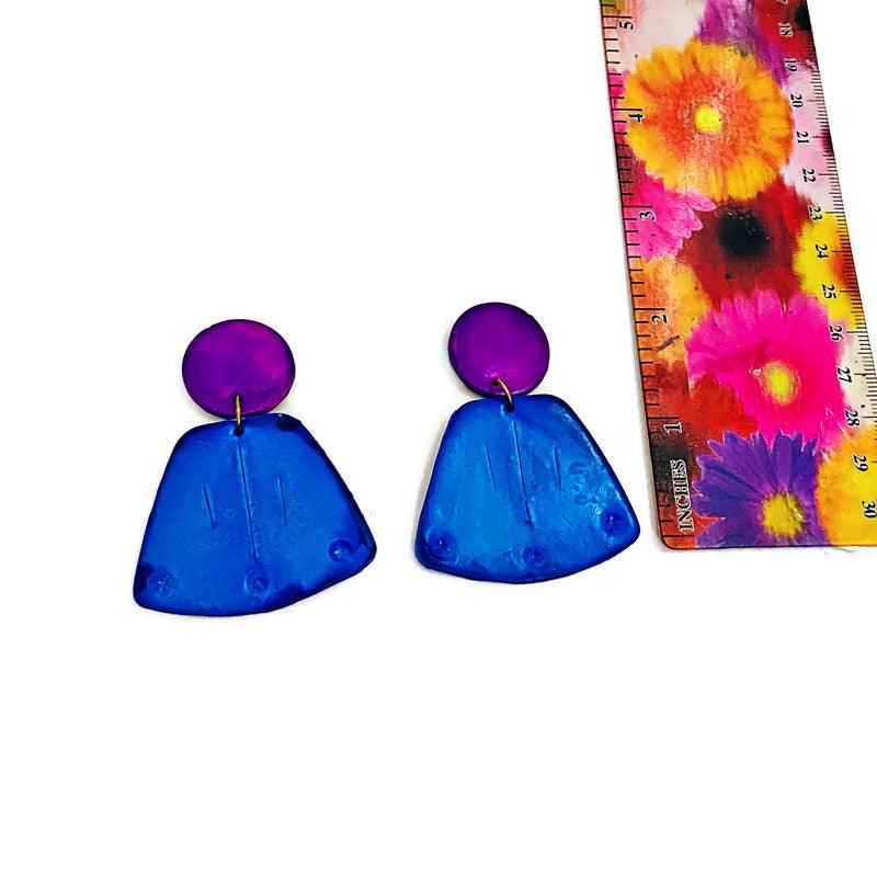 These blue and purple statement earrings were handmade from polymer clay and painted with alcohol ink. After painting, the jewelry pieces were sealed with a gloss.