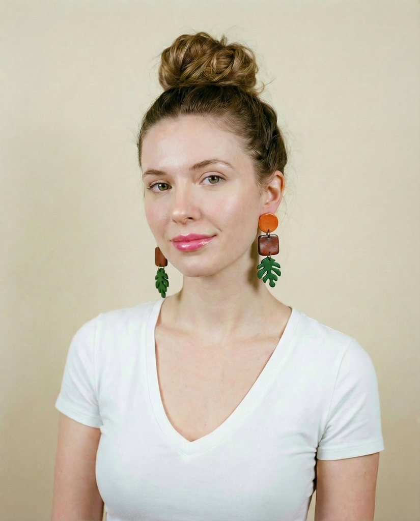 Make a bold statement this autumn with our long statement earrings, featuring a stunning combination of hand-painted polymer clay and natural wood. These unique earrings showcase a beautiful wood leaf, seamlessly blending with the vibrant fall colors of painted clay. Each pair is skillfully handcrafted, resulting in a piece of wearable art that is both striking and elegant. Perfect for autumn outfits, these earrings make an exceptional gift for a sister, friend, or anyone who loves distinctive, handmade fashion.