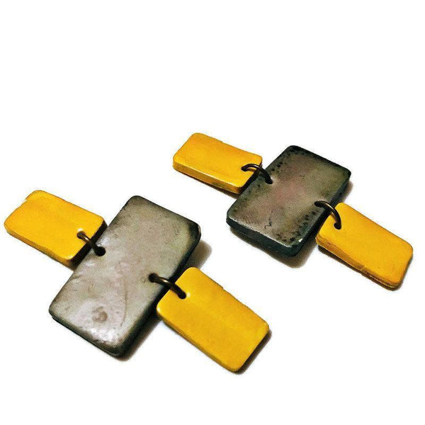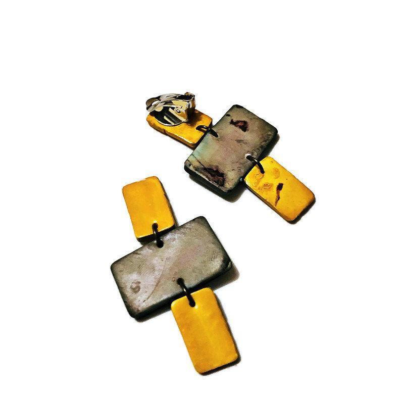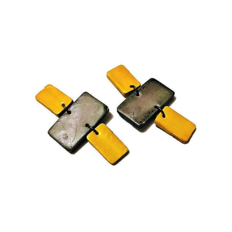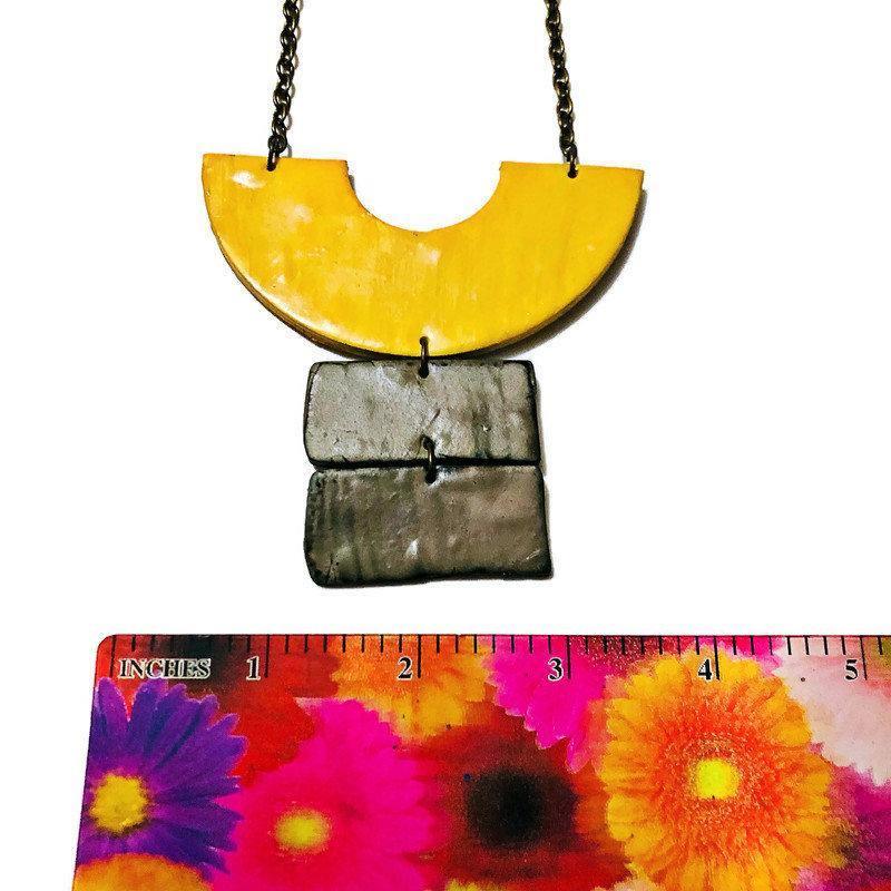 This statement necklace features a chunky geometric design and unique color scheme. The matching earrings are edgy and fun and ae bound to elevate any outfit.