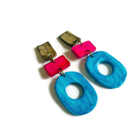 Edgy Geometric Earrings in Gold, Copper & Black with Post or Clip On