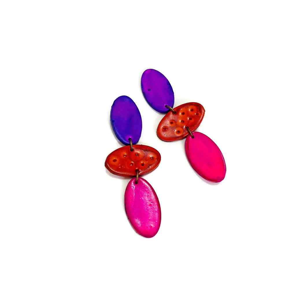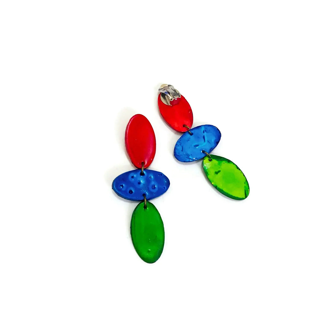 These bright and colorful tri tone clip on earrings were handmade from polymer clay and painted with alcohol ink. They are unique and stylish and bound to make a statement!