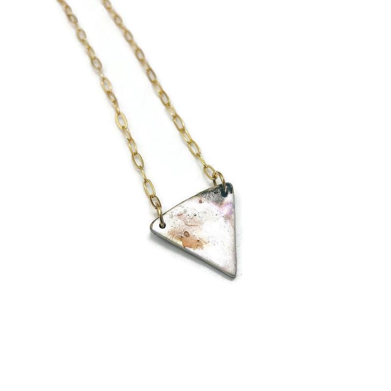 Add a touch of modern elegance with this dainty triangle pendant necklace, featuring a unique polymer clay charm on an 18k gold-plated paperclip chain. Perfect for everyday wear or minimalist wedding jewelry, each piece is handmade with care for a one-of-a-kind finish. Lightweight, timeless, and effortlessly chic — a beautiful gift for brides, bridesmaids, or anyone who loves subtle, sophisticated style.