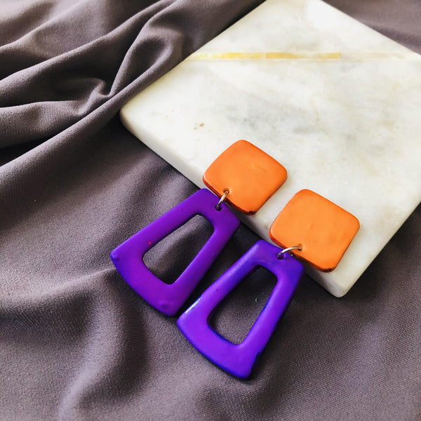 These colorful statement earrings were handmade from polymer clay and hand painted with alcohol ink. They are super lightweight and fun to wear!