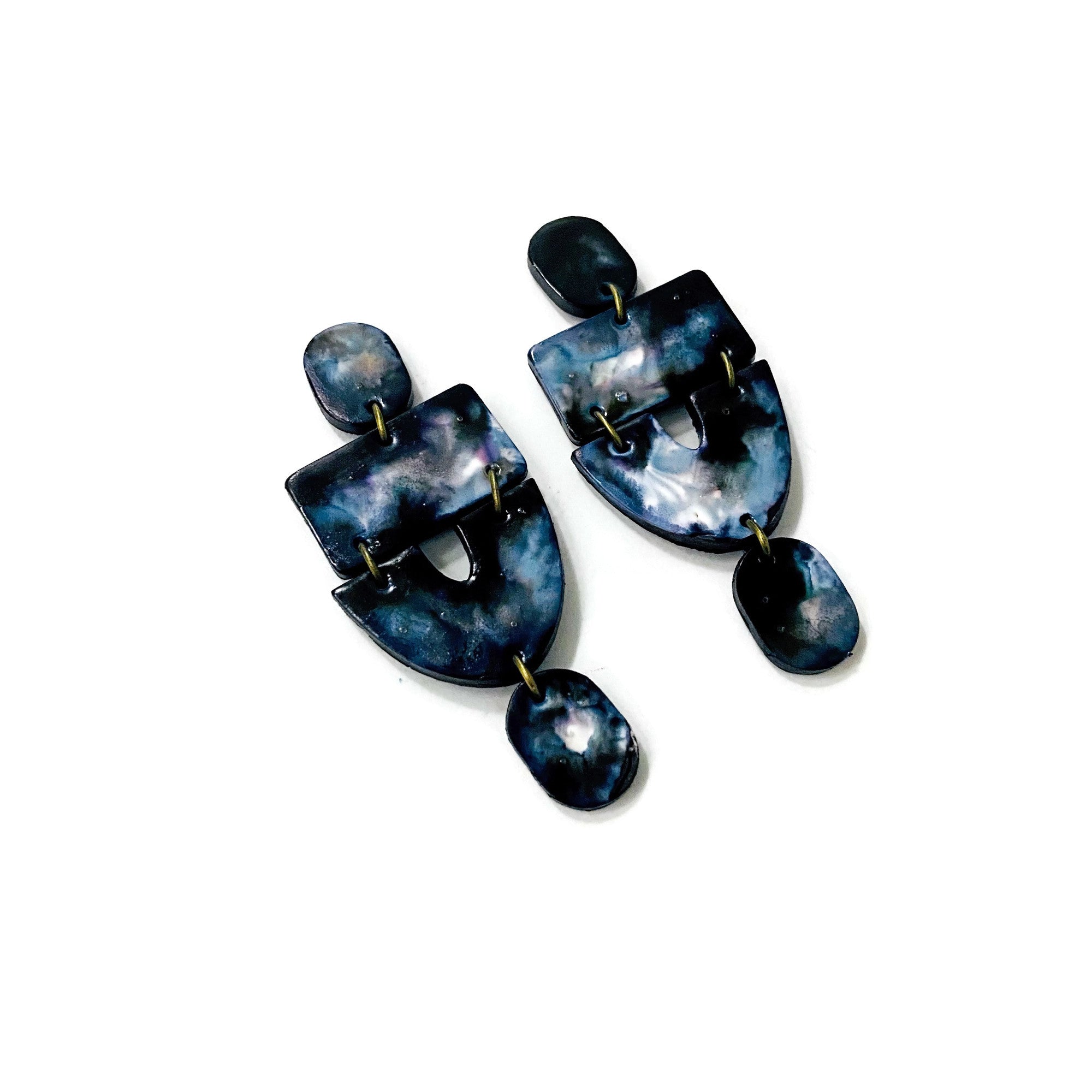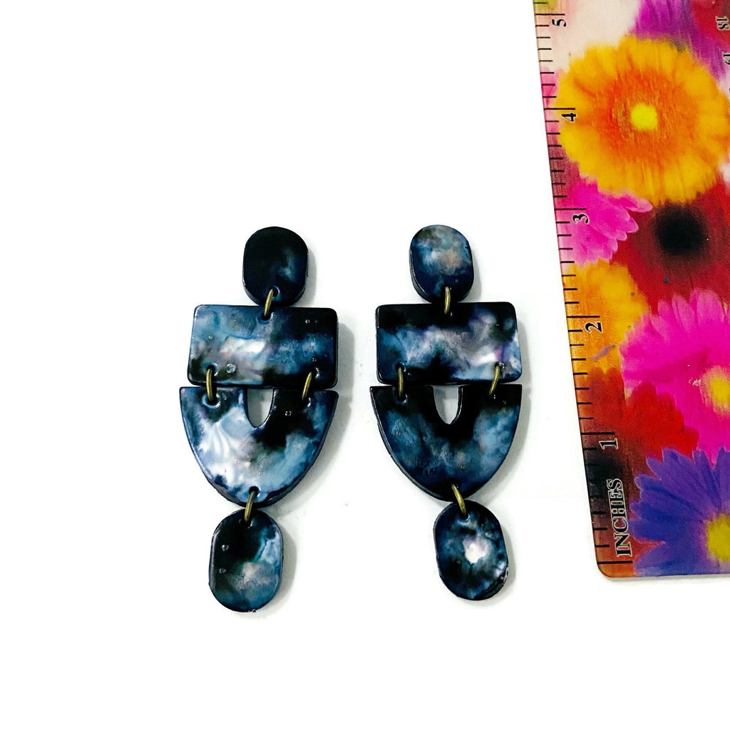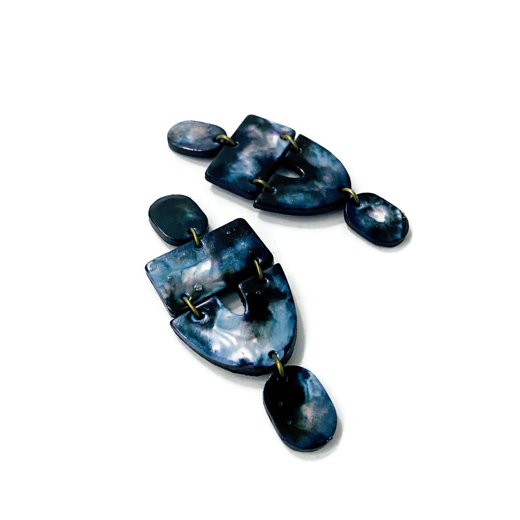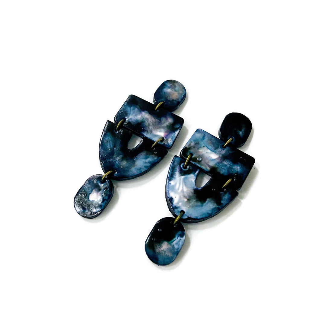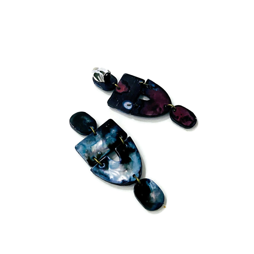 These black and white marbled statement earrings were handmade from polymer clay and hand painted with alcohol ink. They are big and chunky yet lightweight to wear. You can purchase these earrings in multiple color combo and as either post earrings or clip on earrings.