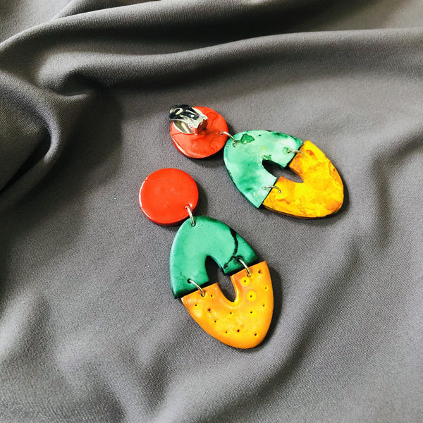 These colorful statement earrings were handmade from polymer clay and hand painted with alcohol ink. They are super lightweight and fun to wear! These earrings can be purchased in multiple colors and as posts or clip ons.