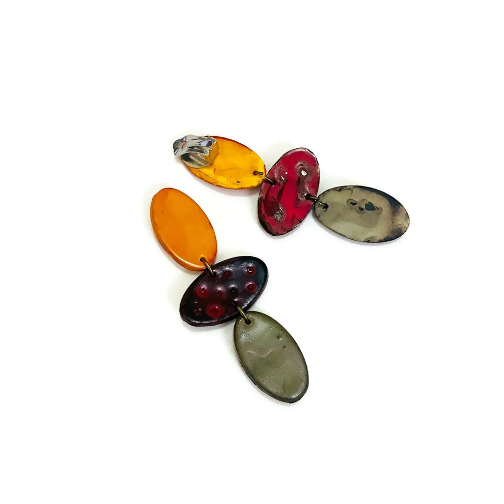 These earth tone clip on earrings were handmade from polymer clay and painted with alcohol ink. They are unique and stylish and bound to make a statement!