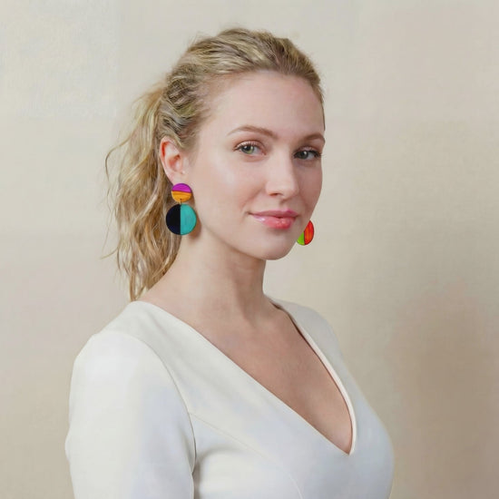 No piercing? No problem. These bold mismatched clip-on earrings are made for non-pierced ears — and they're anything but an afterthought. Handmade from polymer clay and painted with swirling alcohol ink in purple, yellow, black, turquoise, grey, blue, orange, and green, they're a full statement all on their own.