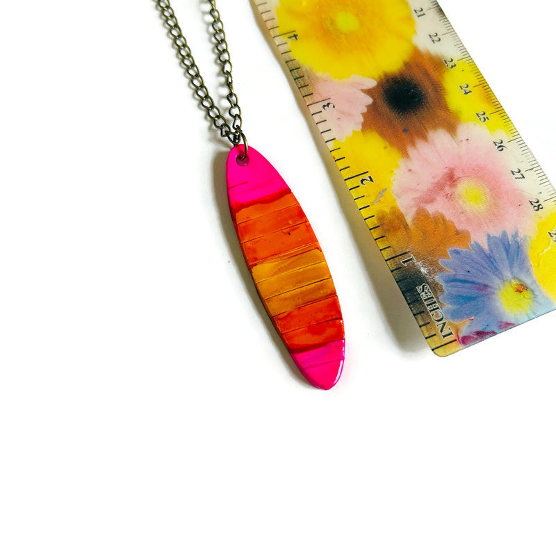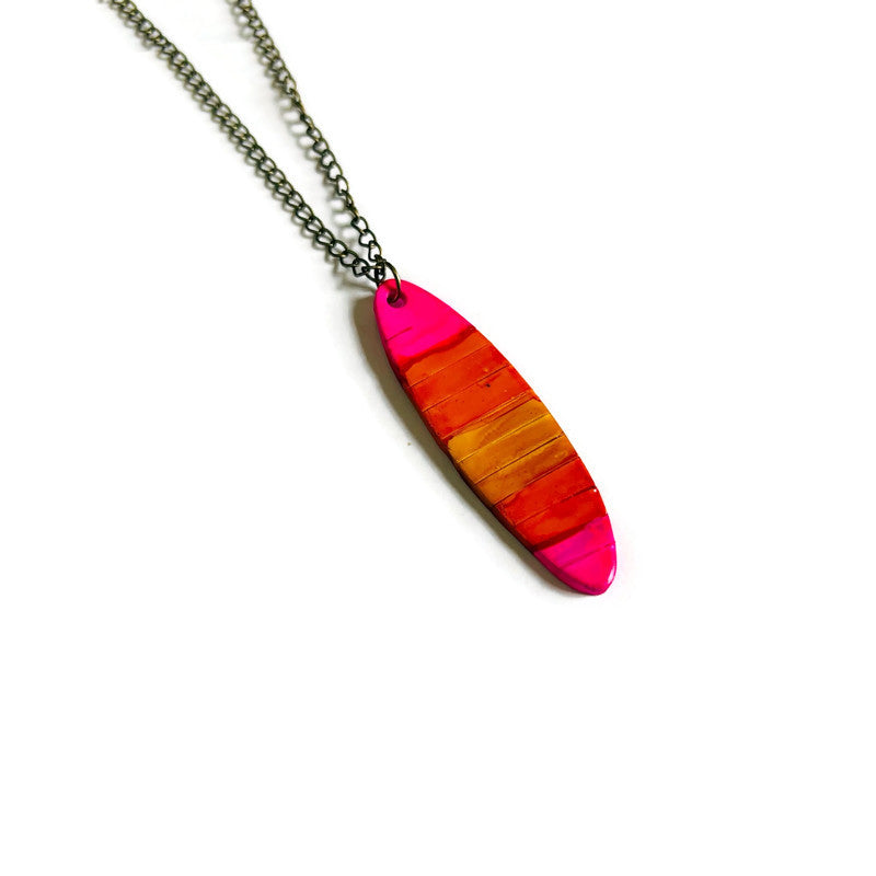 Add a splash of color and charm to your look with this playful ombre striped pendant necklace. Handmade with care, its gradient hues and unique striped design make it a fun statement piece that brightens any outfit. Perfect for those who love a touch of whimsy in their jewelry collection!
