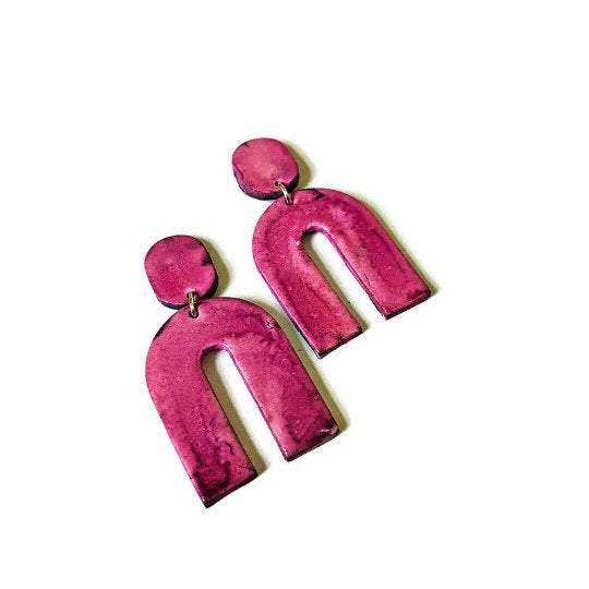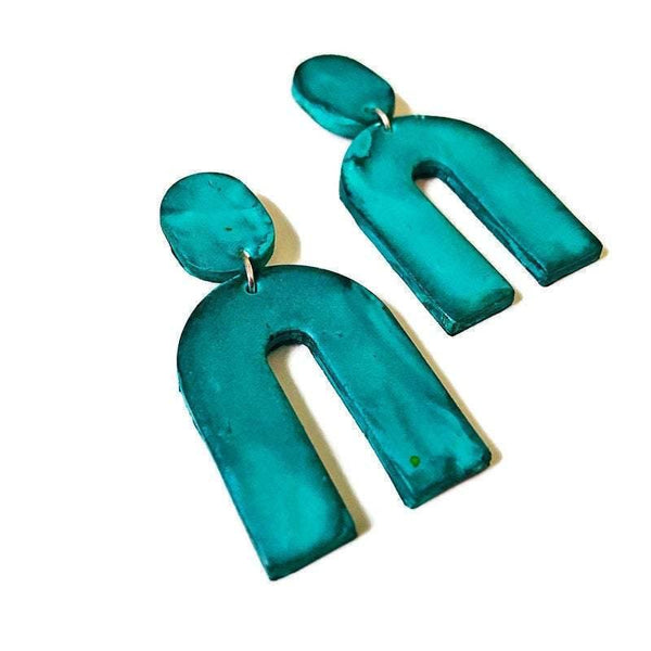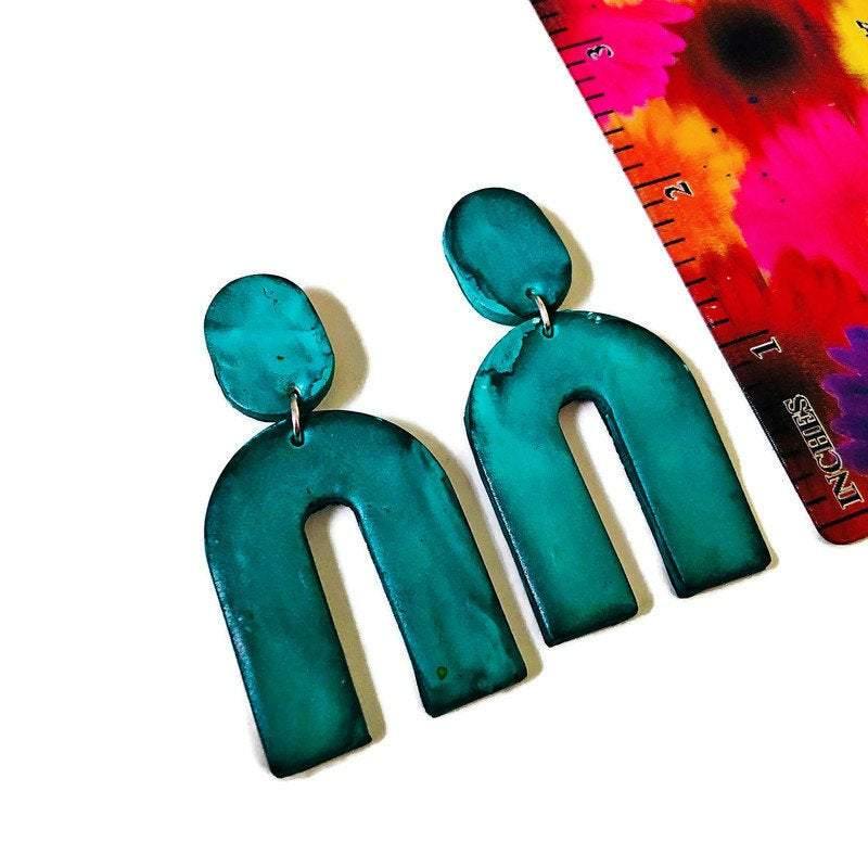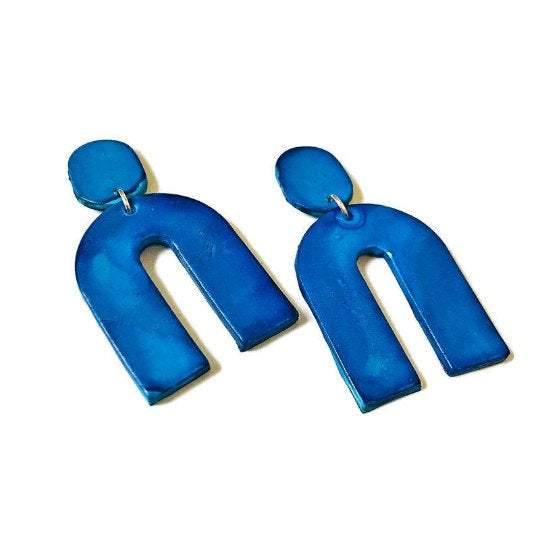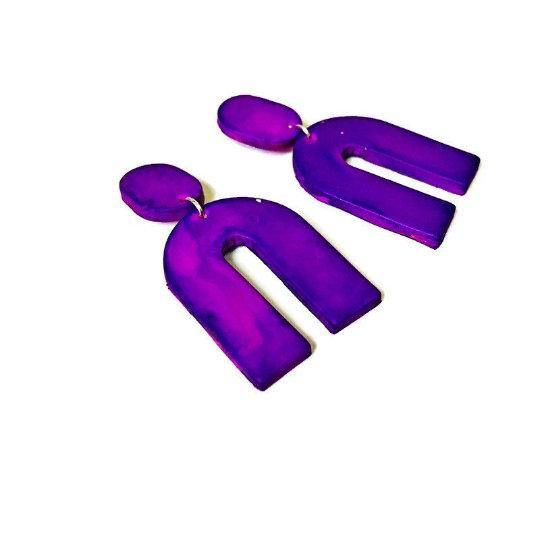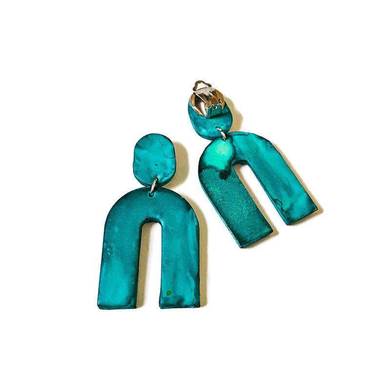 These modern earrings were handmade from polymer clay and painted with alcohol ink. They are large yet lightweight and make a big statement! The earrings feature a smaller oval at the top with either a push back or clip on earring. The bottom portion features a large wishbone shape. From this listing you can purchase the earrings in multiple colors.